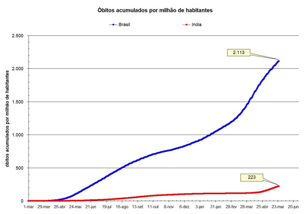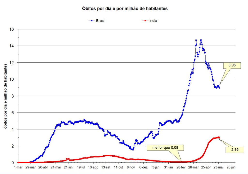 Não é preciso grandes análises para ver que em valores reais a Índia está pior que o Brasil. Se considerarmos que a população da Índia é 6,5 vezes maior que a do Brasil e a densidade demográfica 16,8 vezes maior, a situação fica invertida. A situação do Brasil fica bastante desconfortável. Em outras palavras, se a crise na Índia é grave, no Brasil é mais grave. Na minha opinião, completamente leiga no assunto, acho que as condições do atendimento hospitalar no Brasil são muito melhores que as da Índia. Outro fator que também chama a atenção é a forma como são tratados os mortos, principalmente por motivos religiosos e culturais, muito mais chamativa e espetaculosa na Índia do que no Brasil.