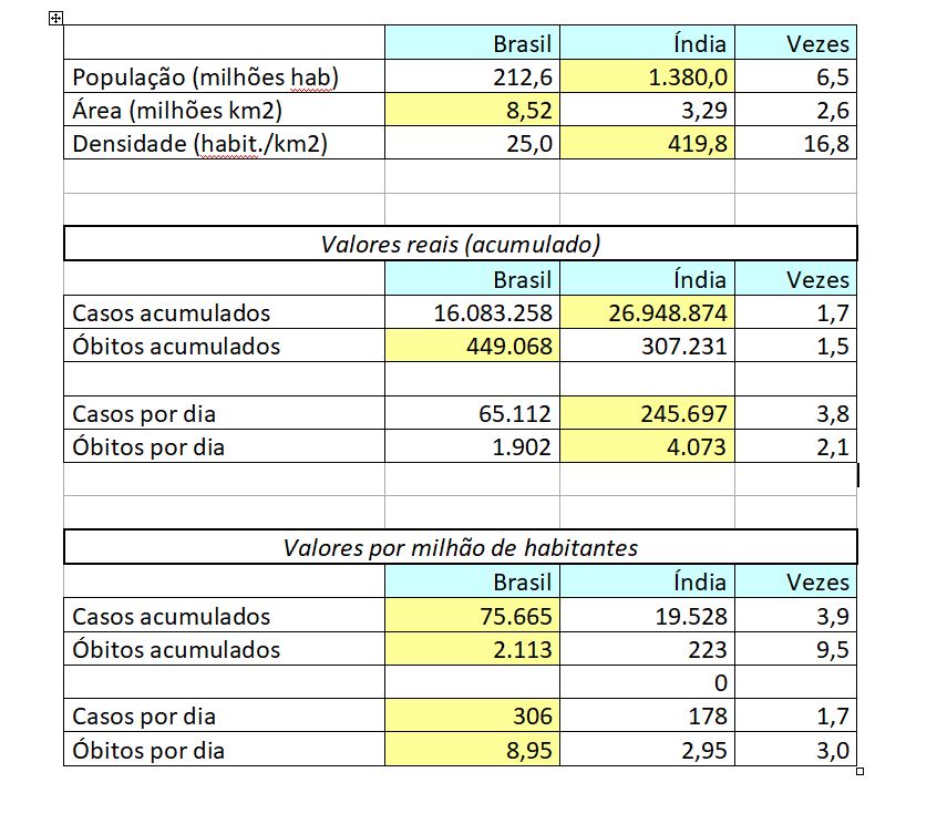 Muito se tem falado da situação da pandemia no Brasil e na Índia. As comparações não podem ser efetuadas analisando-se friamente os números. Os países são muito diferentes, inclusive religiosa e culturalmente.