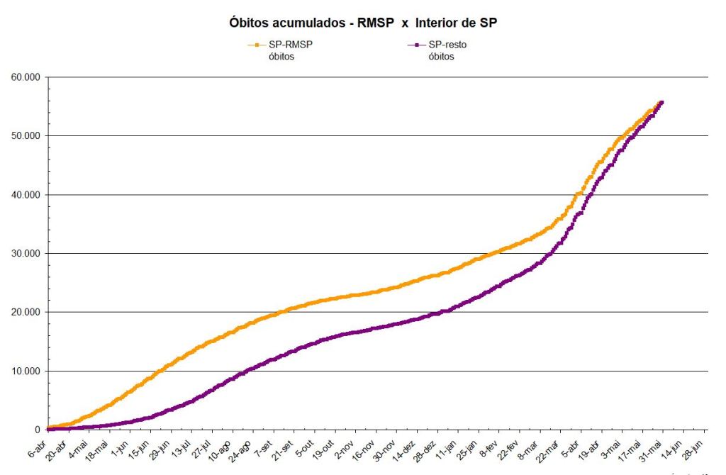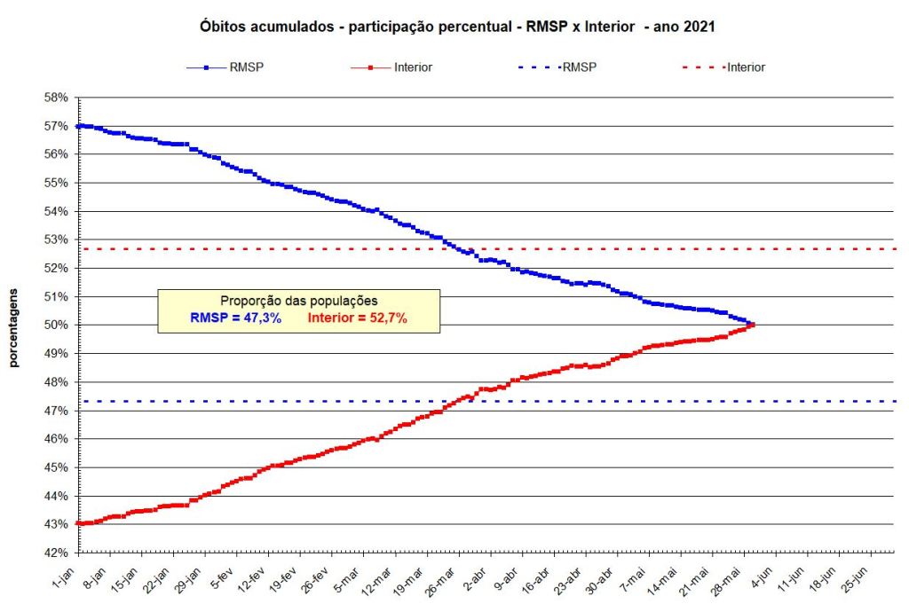 Hoje, dia 30-05-2021, após 440 dias de pandemia, tem-se em SP a igualdade de óbitos entre a RMSP (Região Metropolitana de SP) e os demais municípios do interior e litoral do estado. O quadro abaixo resume os principais dados.