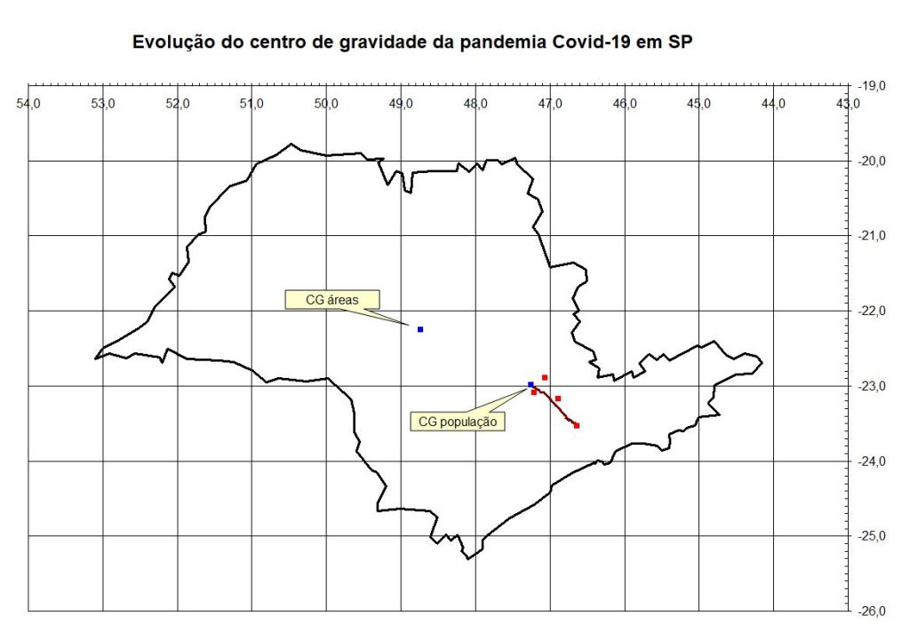 Como se sabe a pandemia começou na cidade de São Paulo e durante esse período a RMSP sempre teve mais óbitos que todo o resto do estado. Como costumo dizer, se o vírus fosse “democrático” teríamos os mesmos índices para todos os municípios, sempre na proporção de 47,3% para a RMSP e 52,7% para o resto. Essa proporção sugere que o CG (centro de gravidade) da população estaria numa localidade próxima de Indaiatuba (11 km) e do aeroporto de Viracopos (9 km) em Campinas.