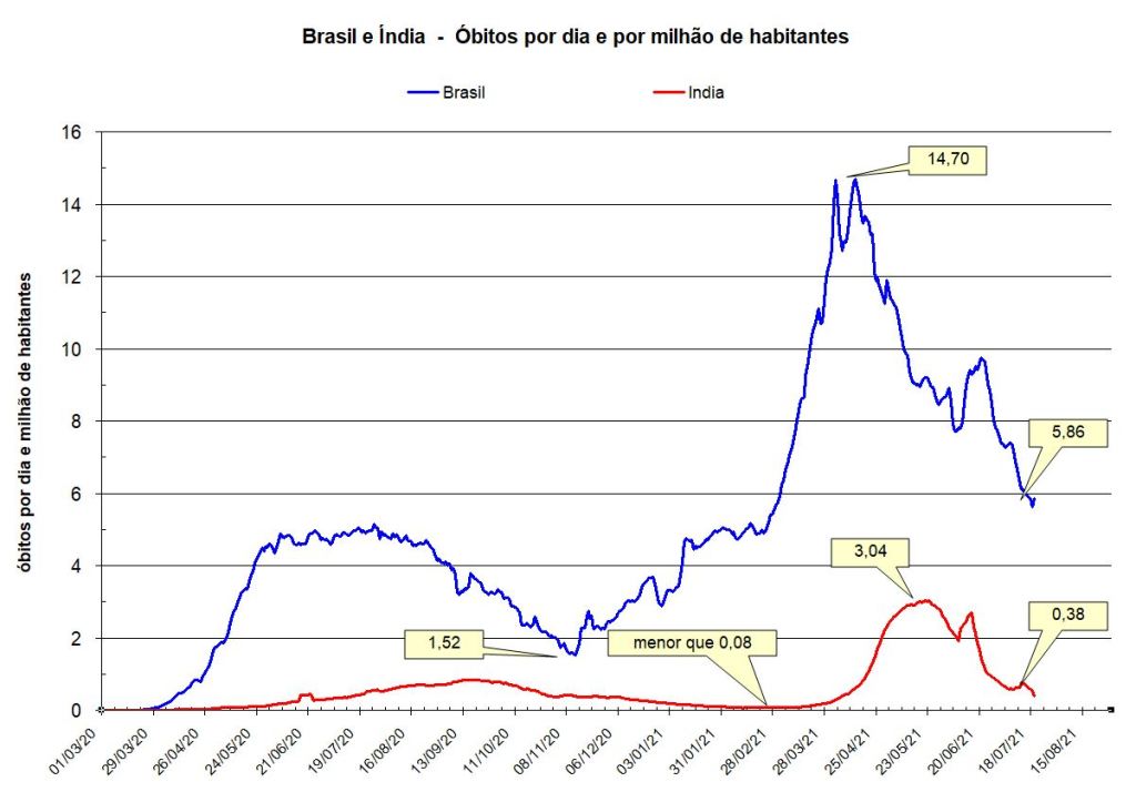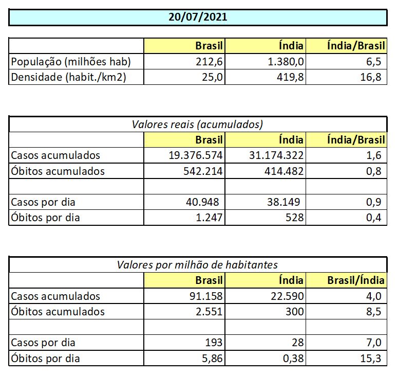 A Índia, por ter uma densidade populacional muito maior que a do Brasil, deveria apresentar números absolutos em casos e óbitos também muito maiores. Não é o que se observa no quadro abaixo.