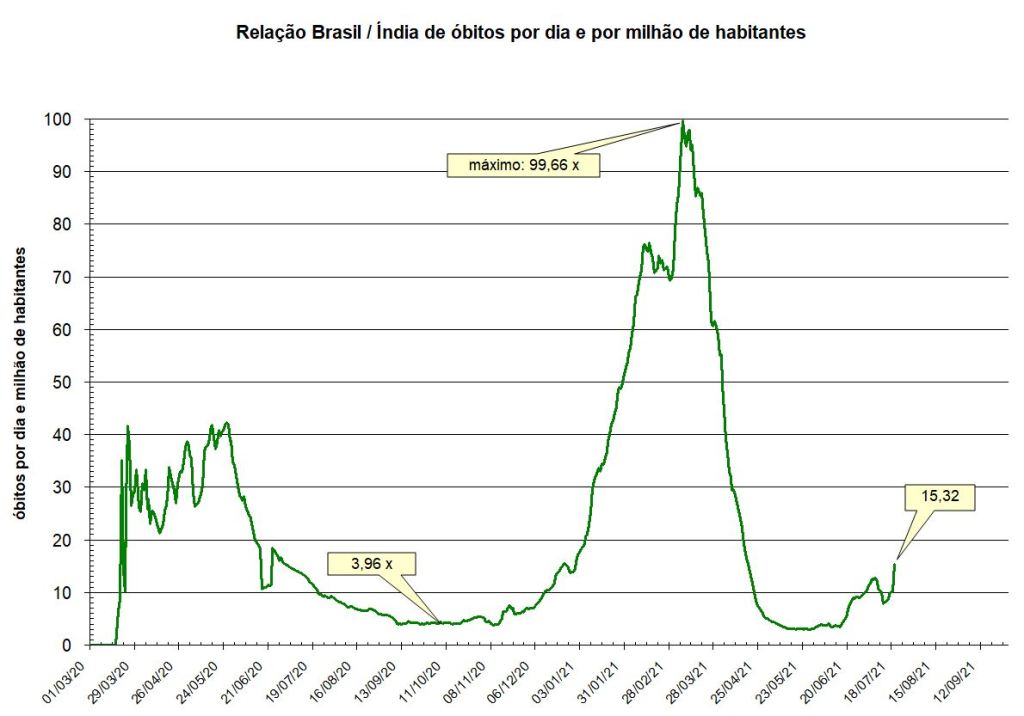 Na mesma Figura 03 temos que no início de março de 2021 o número diário de óbitos no Brasil era 100 vezes maior do que na Índia. Esse número requer uma explicação!