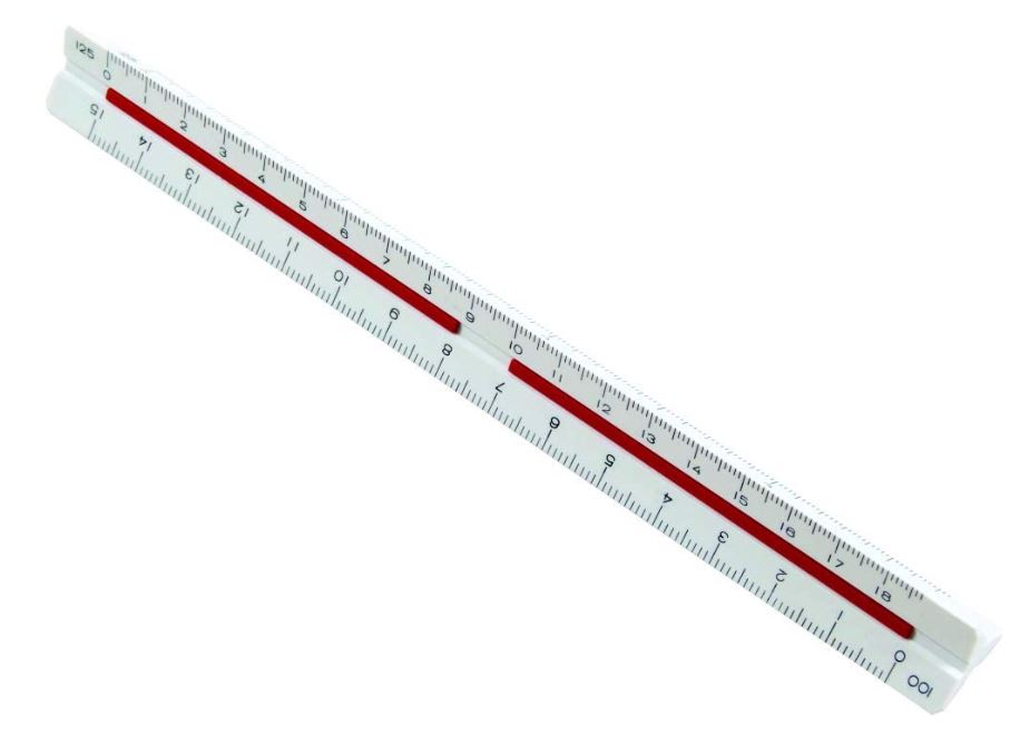 Existem réguas triangulares com 6 escalas: 1:20, 1:25, 1:50, 1:75, 1:100 e 1:125