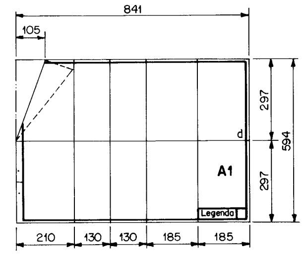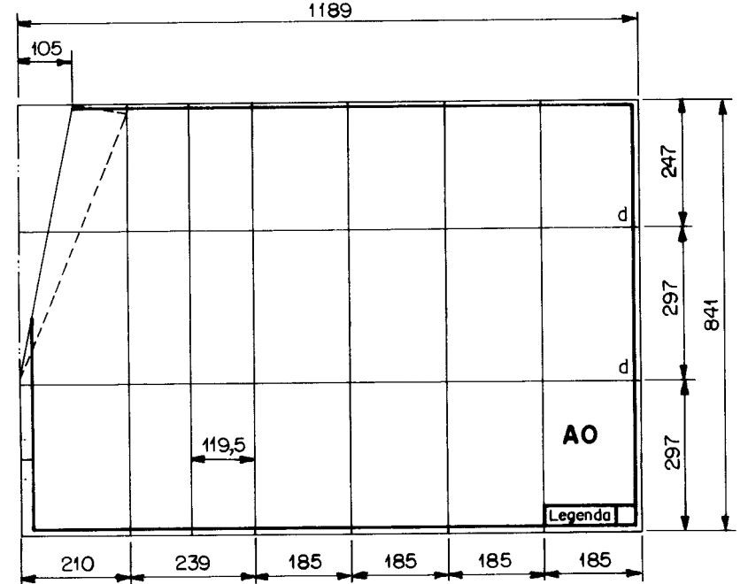 Por exemplo, em uma folha A1, o menor tamanho das marcações de dobra da folha é 130mm que multiplicado por 2 temos 260mm, tamanho recomendado para o aumento da folha. Assim, uma folha A1, que mede 841 x 594 mm, na versão estendida uma vez será 1101 x 594mm. Podemos fazer várias extensões.