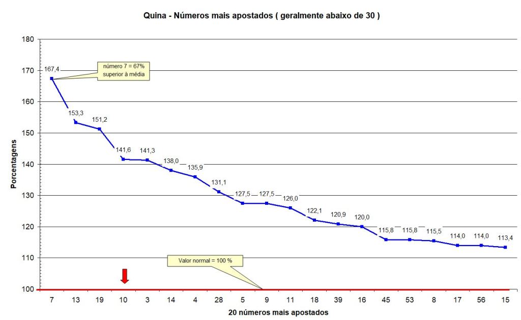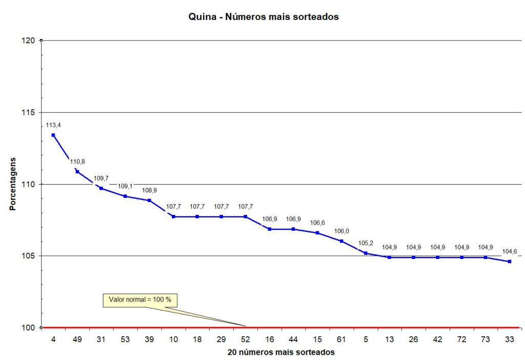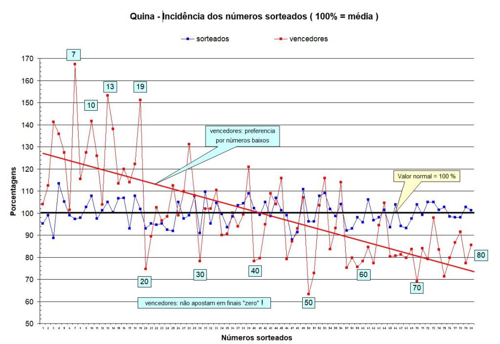 O importante é notar uma preferência por números baixos. O primeiro número a aparecer acima de 40 , que é o divisor dos 80 números da Quina, é o “45”.