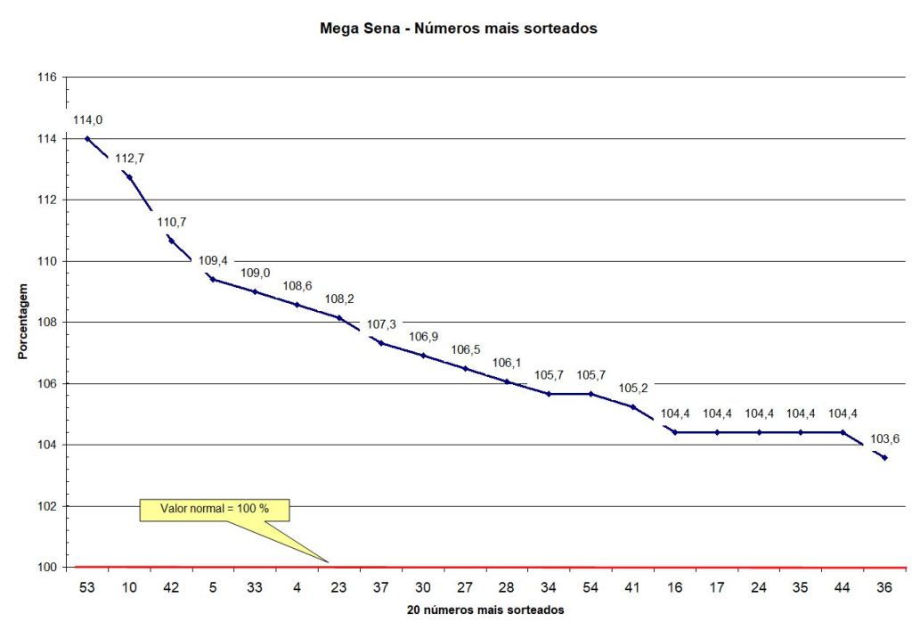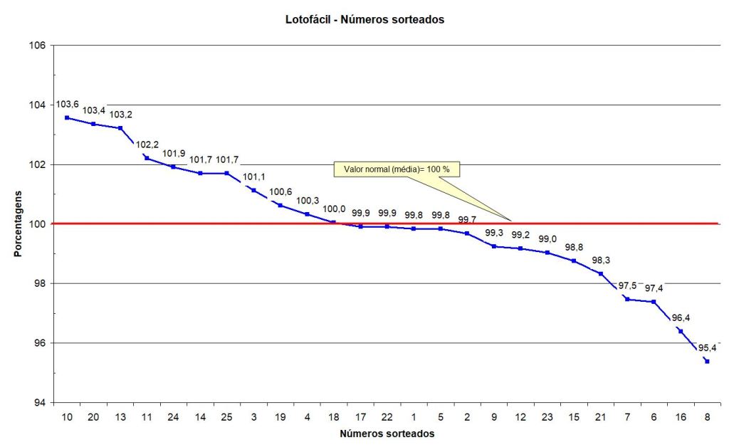 Uma conclusão importante é a verificação que os números sorteados têm uma variação em relação à média de apenas 4% : nenhum abaixo de 96% ou acima de 104%.
