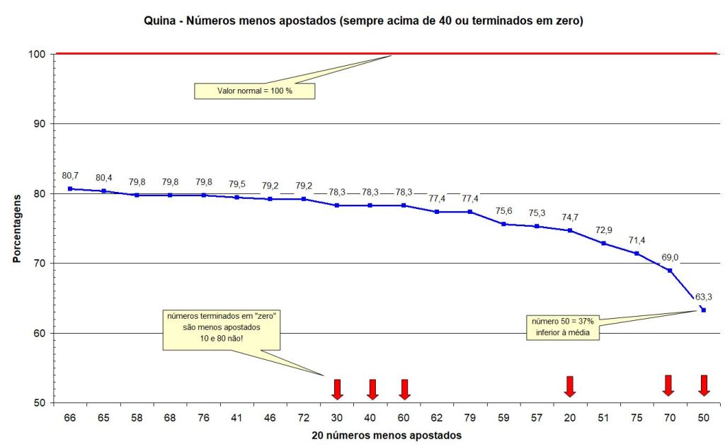 Os números terminados em “zero” e os números altos, talvez por estarem nas extremidades do volante de aposta, são bastante rejeitados.