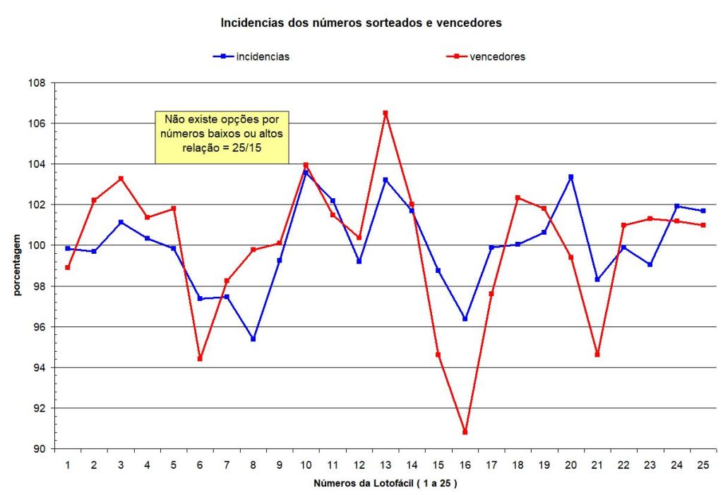 Chamamos de incidências o número de vezes que um número é sorteado nos sorteios. Como esse número varia com os sorteios apresentaremos resultados em relação à média de incidências. Um número com incidência 102,7%, por exemplo, indica que sua incidência é 2,7% superior à incidência média. Da mesma forma, 93,3% indica 6,7% inferior à média de 100%. Para as três principais loterias temos: