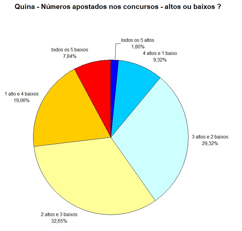 Matematicamente podemos calcular quais as probabilidades de sorteio dos números da Quina (01 a 80). Os números baixos (01 a 40) e os números altos(41 a 80) pocdem ter estes agrupamentos: