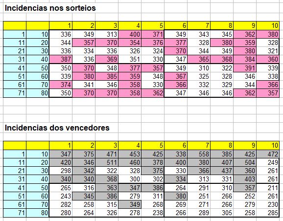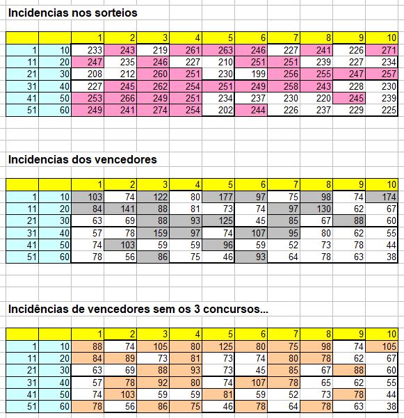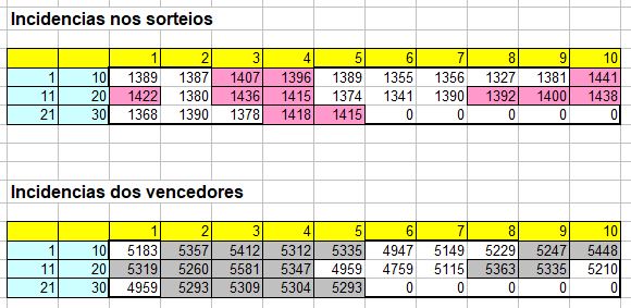 Como pode ser observado, nas incidências dos sorteios há uma distribuição aleatória, sem nenhuma preferência. No caso das incidências dos vencedores, isto é, dos sorteios que tiveram vencedores, há uma clara preferência por números baixos. Alguns números, como 7 e o 13, aparecem sempre com maior incidência. De outro lado os números altos e os terminados em “0” têm baixa preferência.