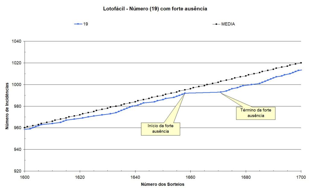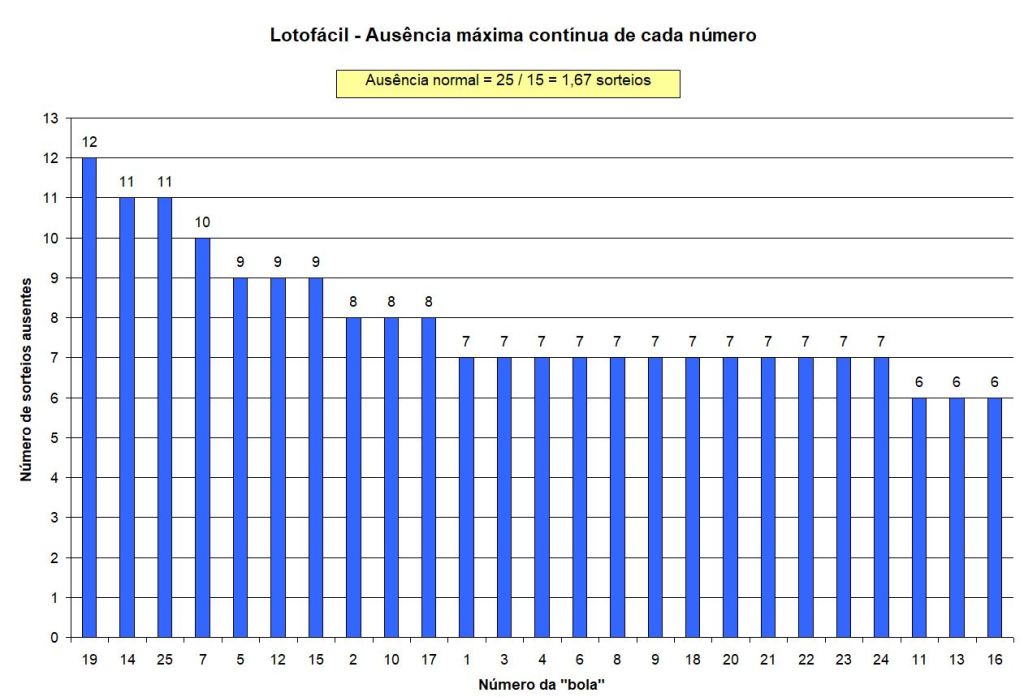 O número 19 esteve ausente durante 12 sorteios consecutivos; a média é a cada 1,67.