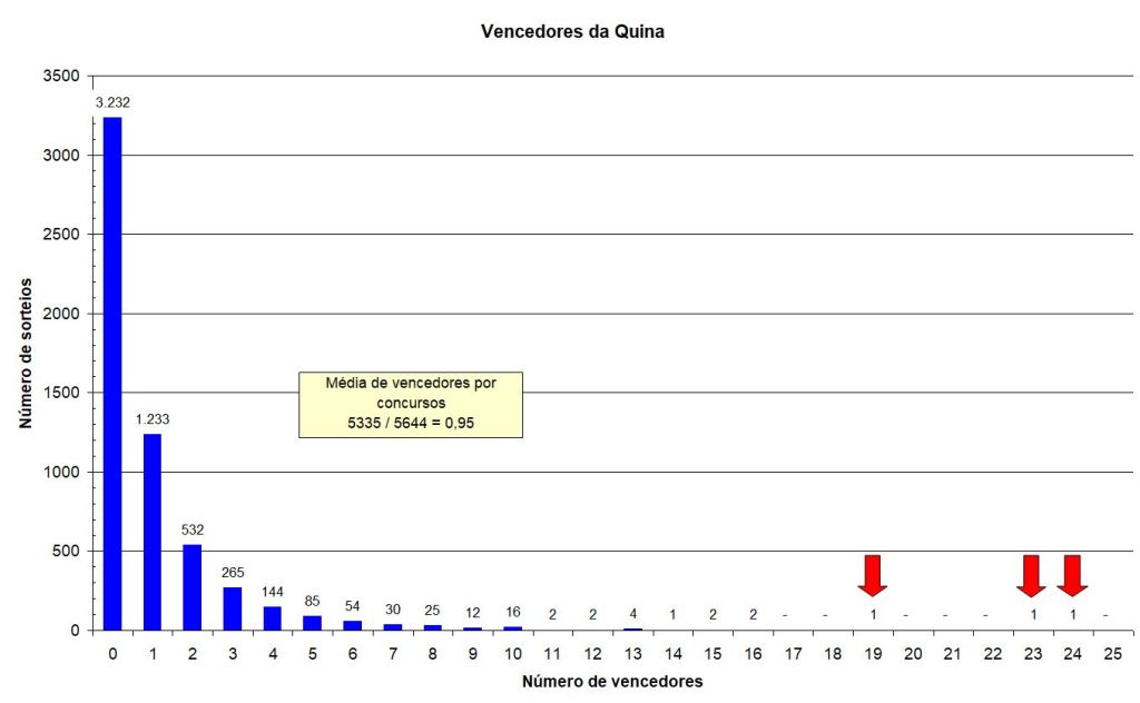 No caso da Quina, onde a expectativa é de 0,95 vencedores por sorteio, já tivemos casos de 19, 23 e 24 acertadores no mesmo sorteio. No sentido contrário, na Quina de São João de 2019 não houve nenhum acertador, apesar do enorme volume apostado.