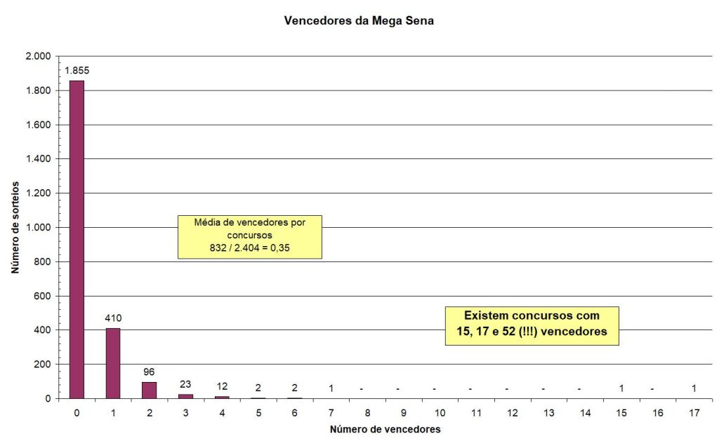 Na Mega Sena a distorção é muito maior. A expectativa de acertar é apenas 0,35 vencedores por sorteio mas tivemos sorteios com 15, 17 e 52 (!!!) acertadores.