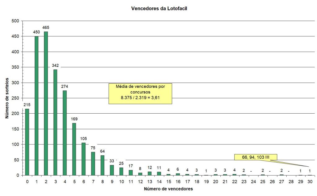 Na Lotofácil a média esperada é de 3,61 vencedores por sorteio mas tivemos sorteios com 66, 94 e 103 acertadores.