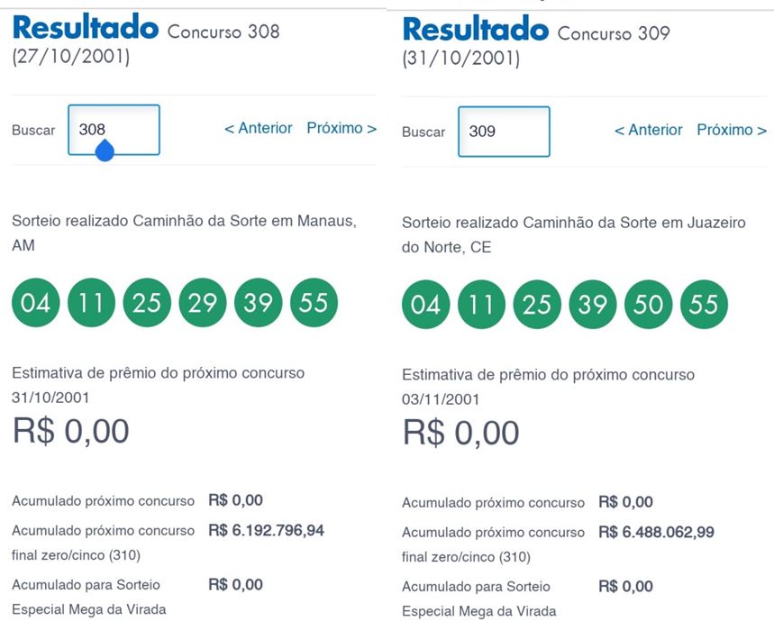 O destaque fica para os sorteios 308 e 309, que são consecutivos.