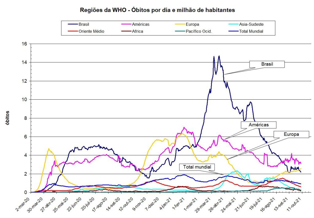 4) Regiões da WHO – Óbitos por dia e milhão de habitantes em 12-10-2021
